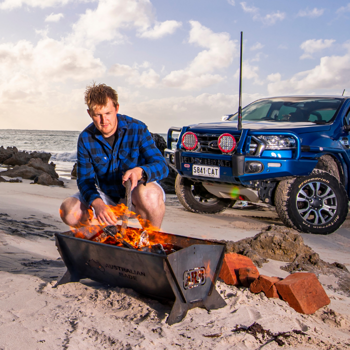 This is a seriously sturdy and versatile fire pit that will be just as useful at home entertaining guests in the backyard, as it will be at your favourite campsite. A fire pit for camping has to be portable and while the design of the ARB Fire Pit might not scream “revolution”, they have added some key elements that make a good design great. The base structure of the fire pit is a five-piece assembly, slotting together without requiring any tools. To ensure longevity and improved heat retention, all pieces are cut from a solid three-millimetre sheet of REDCOR® steel. A base plate ensures the coals and associated heat remain in the pit, while the top edges are folded with integrated tabs to secure the included cooking grill. It is also designed to suit your own sourced cast iron BBQ plates and rotisserie. The included cooking grill utilises half of the fire pit’s top opening and features both a grill and hotplate section. The cooking grill is made from 4mm mild steel and can be seasoned with cooking oil and a quality fire. The whole unit collapses down and fits neatly into the supplied Australian made canvas carry bag.