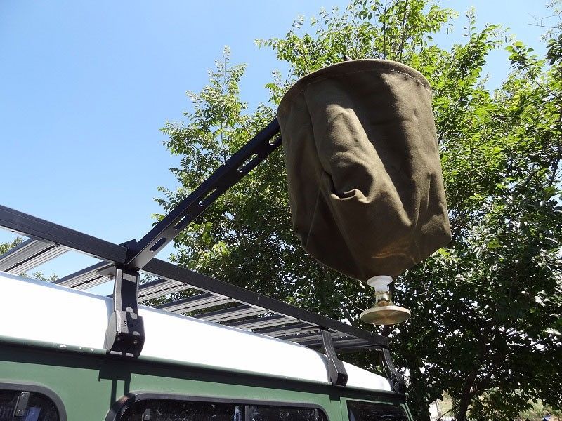 Mount the base plate to the slats on the sides of a Front Runner Roof Rack Tray, then quickly snap in and retract the folded arm for the perfect solution for hanging your solar shower or showerhead